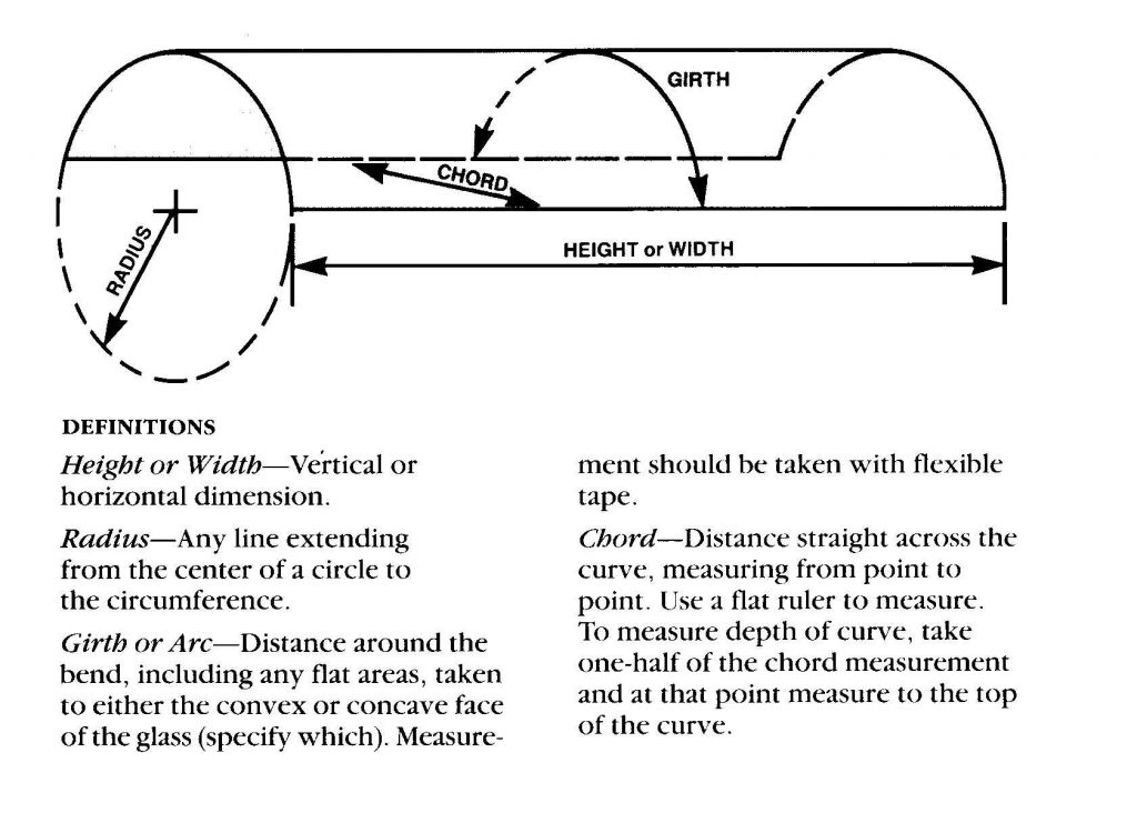Unlike the length and width dimensions required to order a piece of flat glass, the fabrication of curved glass requires precise dimensions of the shape of the glass. There are two ways to describe the shape. The first consists of the girth, height or width, and radius dimensions. When the radius is not known, the chord and depth dimensions can be provided. A flexible tape measure is needed to measure the outside girth. A flat measurement is used to measure the height/width, inside chord, and inside depth. A hardboard or mylar template is required with all the dimensions noted above if an accurate radius dimension cannot be provided.