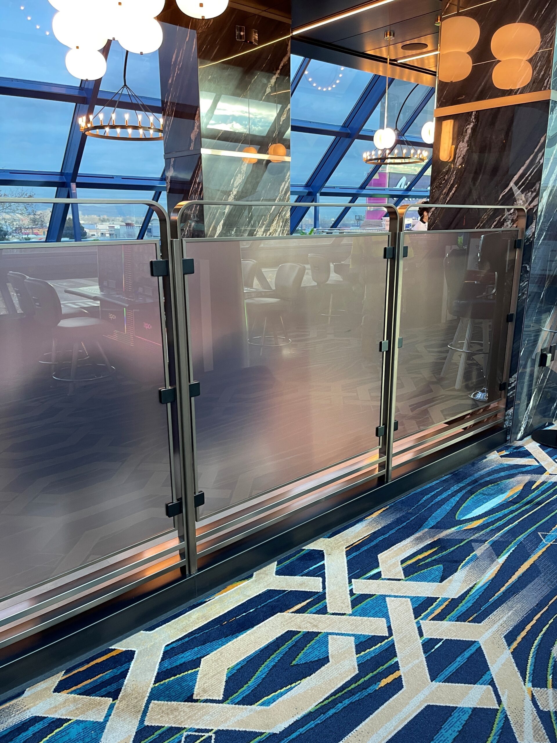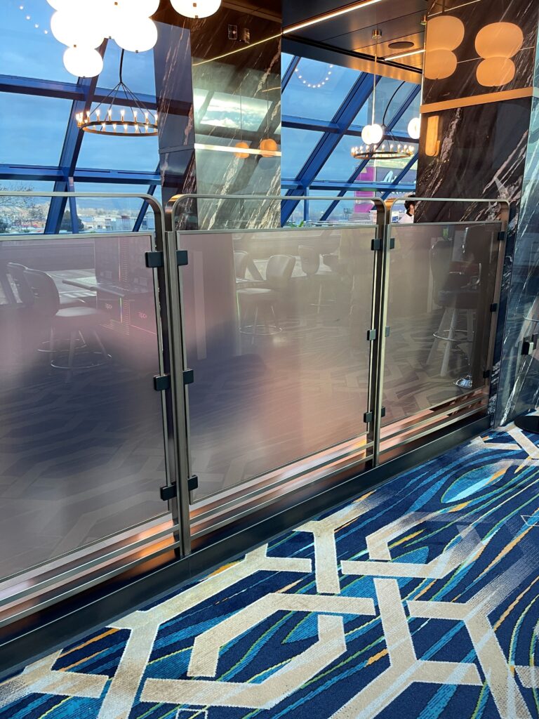 Bent Glass Design supplied curved and flat glass laminates with a light bronze appearance and an etch on the first surface of the glass for the glass portal and railings.  In addition, laminated glass was installed in the Sky Terrace’s wine case.