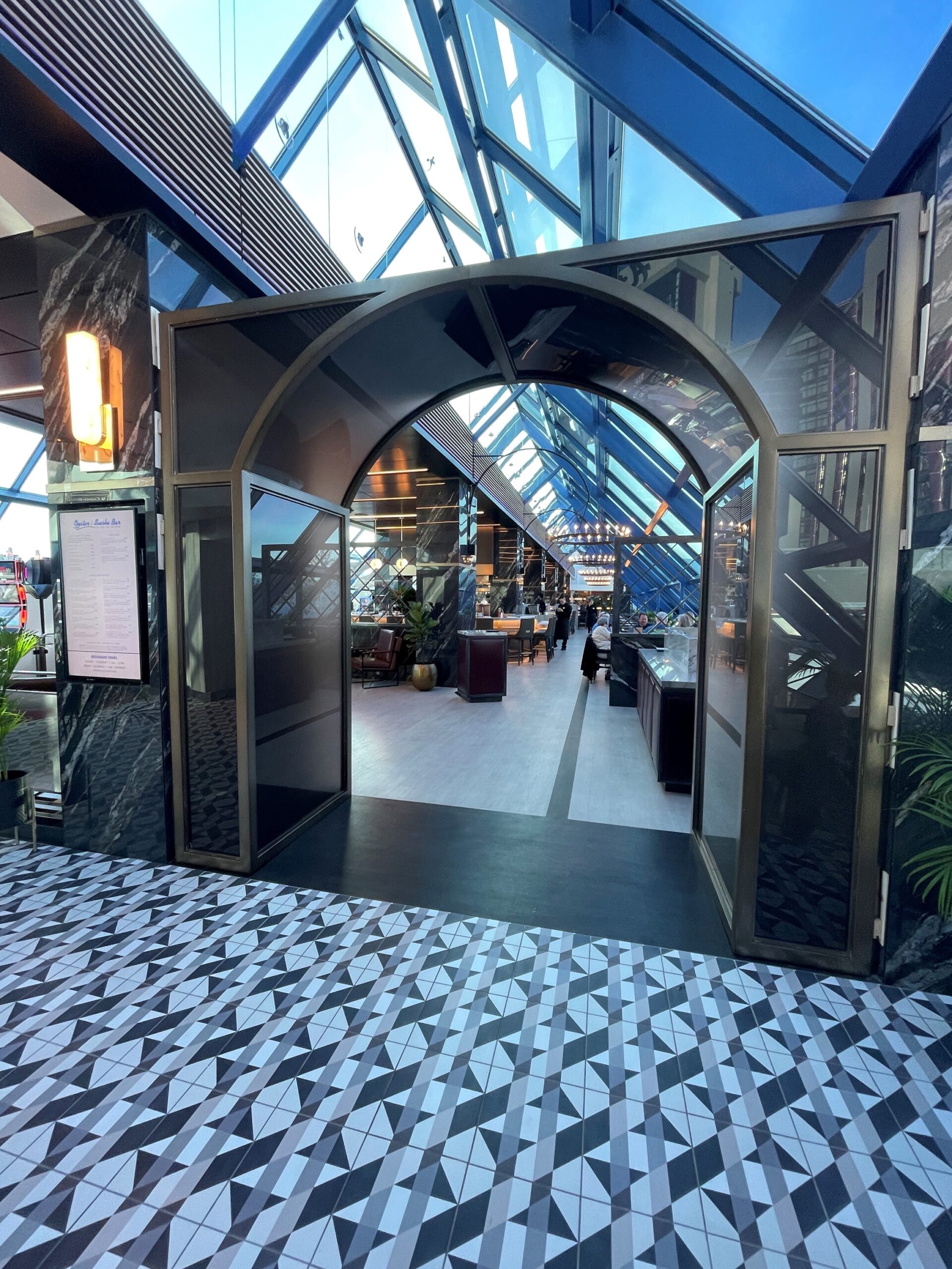 Diners at the Oyster and Sushi Bar, located on the Sky Terrace of the Atlantis Casino Resort Spa in Reno, Nevada, are treated to delicious meals and spectacular views of downtown Reno and the mountains. The elegance of the Sky Terrace is enhanced by an attractive glass portal and structural glass railing—both made with laminated glass from Bent Glass Design.